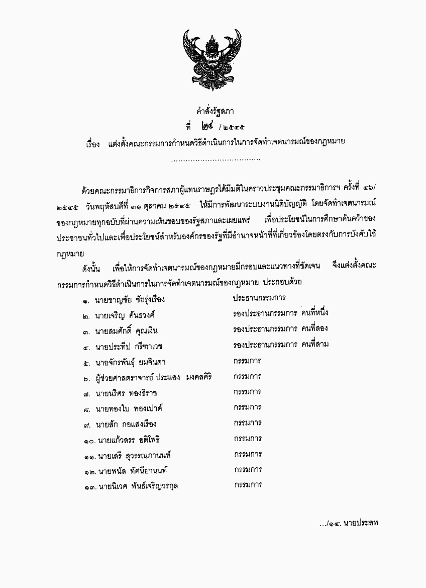 คำสั่งรัฐสภา ที่ 24 / 2545 เรื่อง แต่งตั้งคณะกรรมการกำหนดวิธีดำเนินการในการจัดทำเจตนารมณ์ของกฎหมาย |