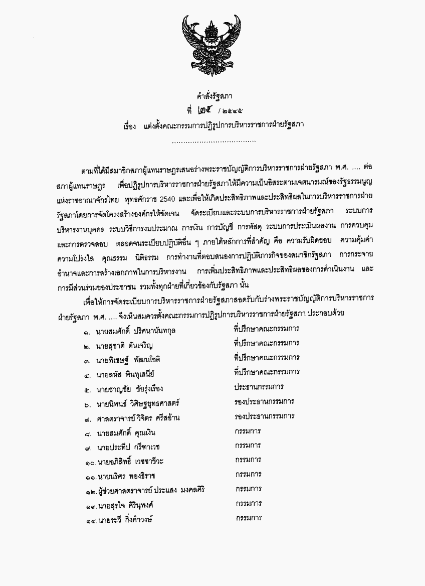 • คำสั่งรัฐสภา ที่ 25 /2545 เรื่อง แต่งตั้งคณะกรรมการปฏิรูปการบริหารราชการฝ่ายรัฐสภา