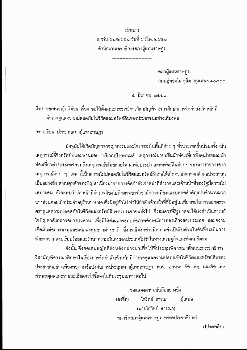 ญัตติด่วน เรื่อง ขอให้ตั้งคณะกรรมาธิการวิสามัญพิจารณาศึกษาการจัดกำลังเจ้าหน้าที่ตำรวจดูแลความปลอดภัยในชีวิตและทรัพย์สินของประชาชนอย่างเพียงพอ (นายโกวิทย์ ธารณา กับคณะ เป็นผู้เสนอ) |