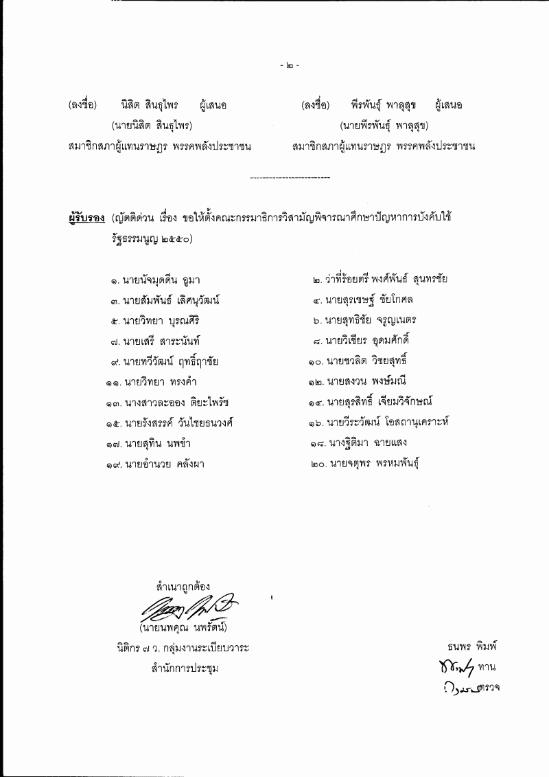 ญัตติด่วน เรื่อง ขอให้ตั้งคณะกรรมาธิการวิสามัญพิจารณาศึกษาปัญหาการบังคับใช้รัฐธรรมนูญ ๒๕๕๐ (นายบุญจง วงศ์ไตรรัตน์ กับคณะ เป็นผู้เสนอ) |