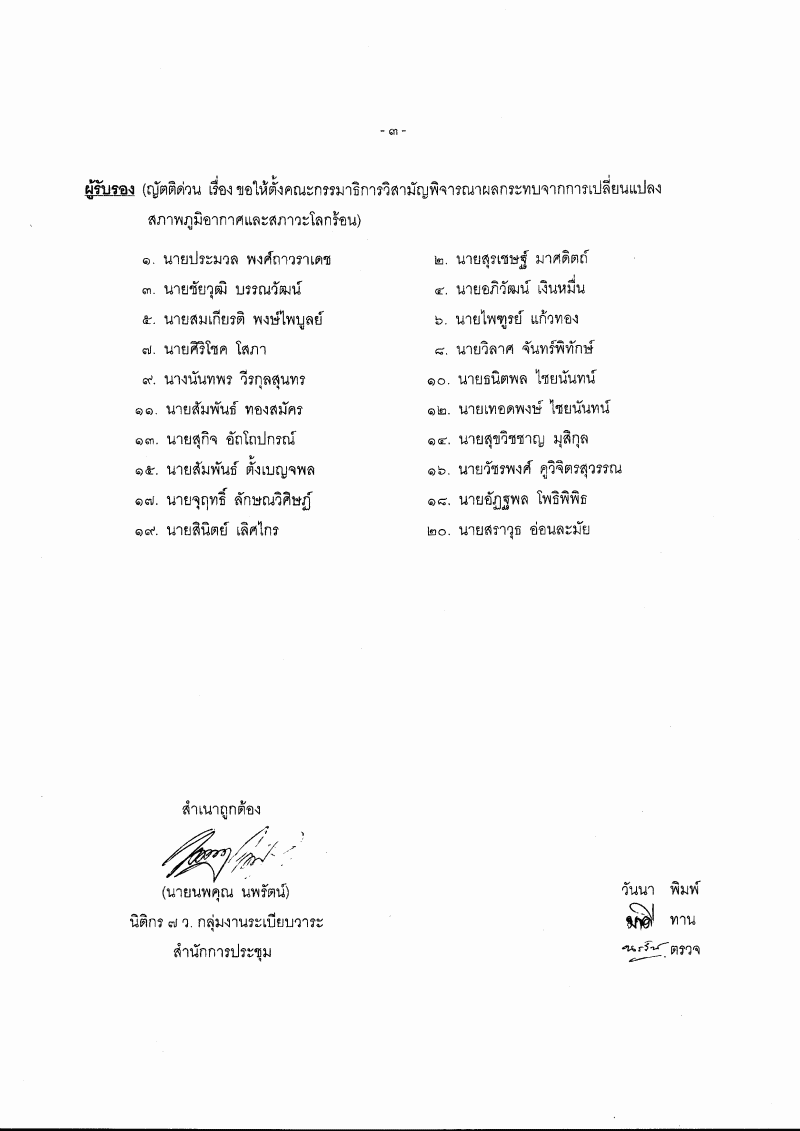 • ญัตติด่วน เรื่อง ขอให้ตั้งคณะกรรมาธิการวิสามัญพิจารณาผลกระทบจากการเปลี่ยนแปลงสภาพภูมิอากาศและสภาวะโลกร้อน (คุณกัลยา โสภณพนิช กับคณะ เป็นผู้เสนอ)