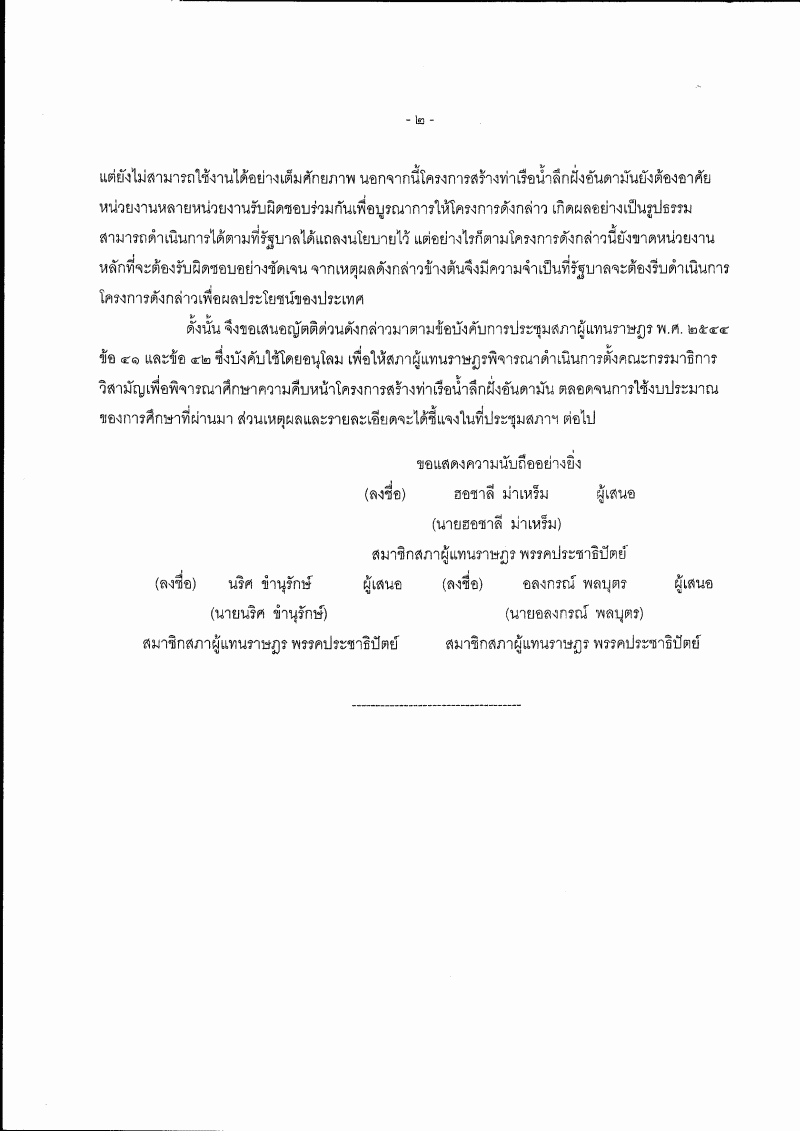 ญัตติด่วน เรื่อง ขอให้ตั้งคณะกรรมาธิการวิสามัญเพื่อพิจารณาศึกษาความคืบหน้าโครงการสร้างท่าเรือน้ำลึกฝั่งอาดามัน (นายฮอชาลี ม่าเหร็ม กับคณะ เป็นผู้เสนอ) |