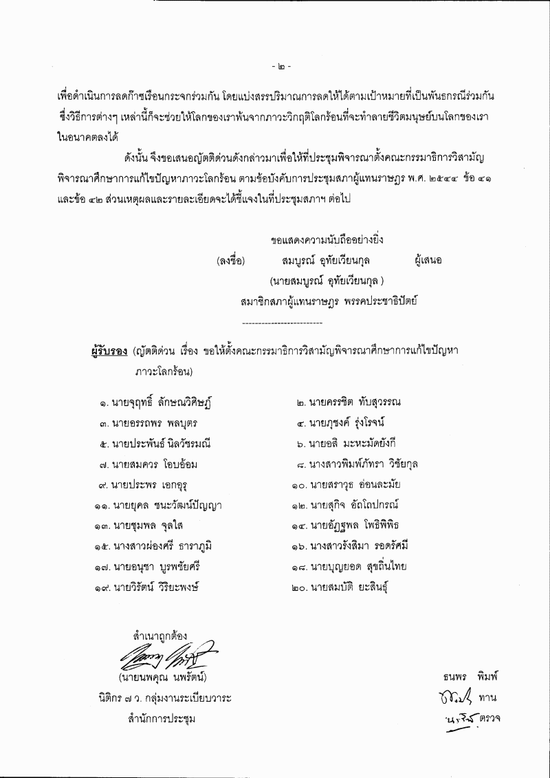 • ญัตติด่วน เรื่อง ขอให้ตั้งคณะกรรมาธิการวิสามัญพิจารณาศึกษาการแก้ไขปัญหาภาวะโลกร้อน (นายสมบูรณ์ อุทัยเวียนกุล เป็นผู้เสนอ)