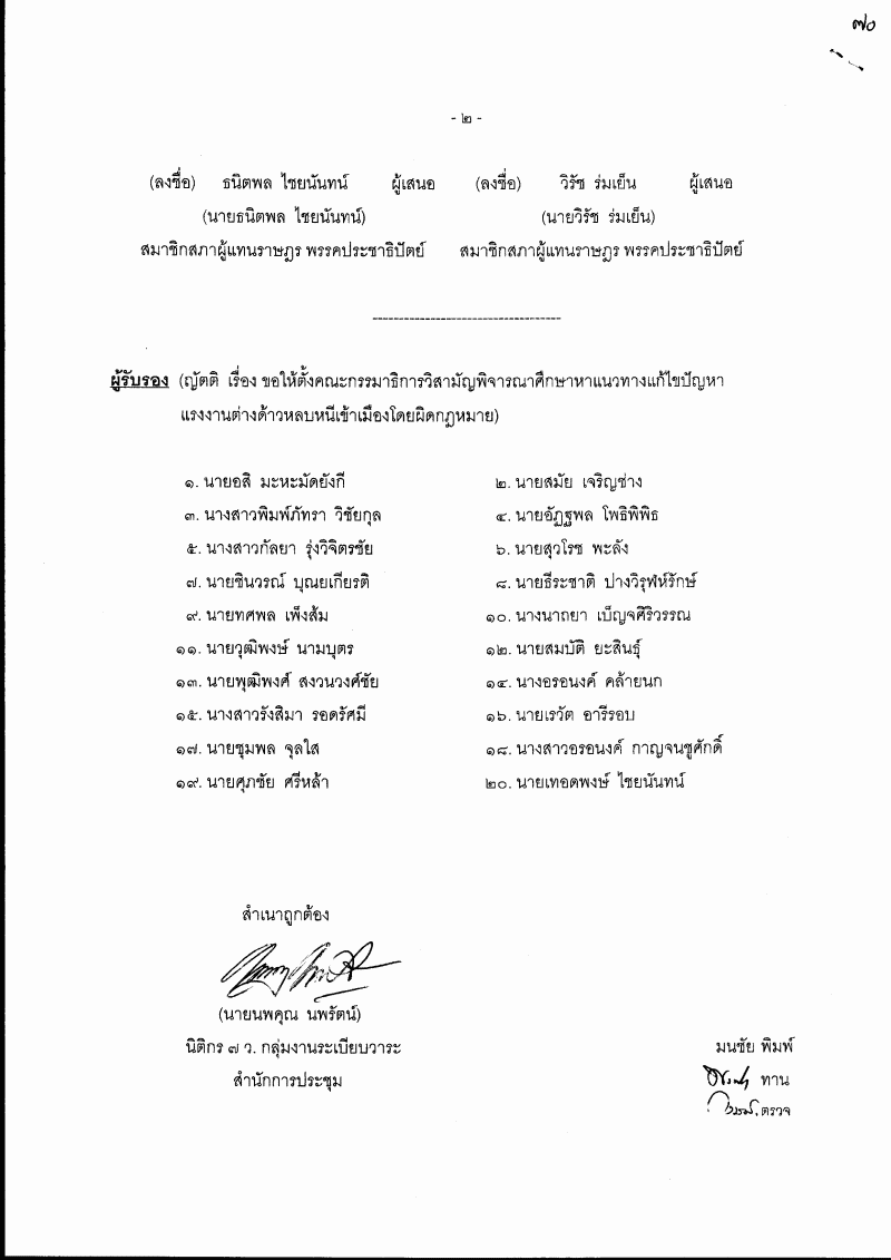 • ญัตติ เรื่อง ขอให้ตั้งคณะกรรมาธิการวิสามัญพิจารณาศึกษาหาแนวทางแก้ไขปัญหาแรงงานต่างด้าวหลบหนีเข้าเมืองโดยผิดกฎหมาย (นาวาตรี สุธรรม ระหงษ์ กับคณะ เป็นผู้เสนอ)