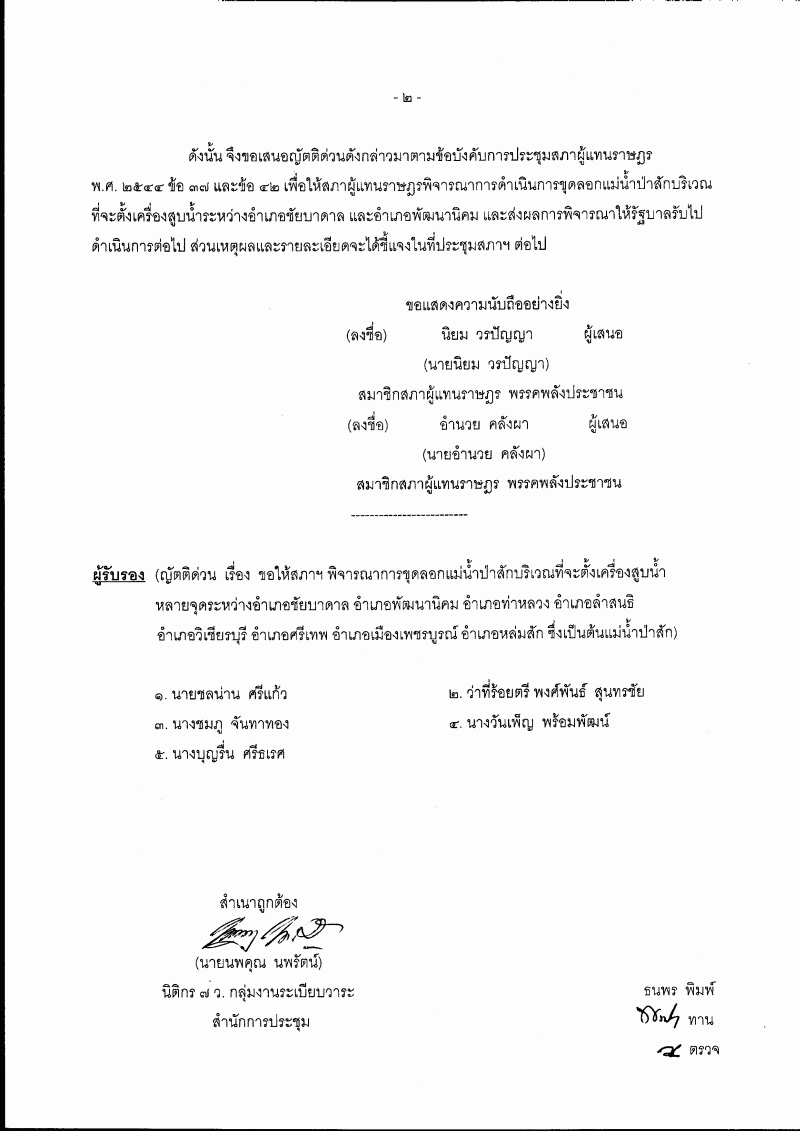 • ญัตติ เรื่อง ขอให้สภาฯ พิจารณาการขุดลอกแม่น้ำป่าสักบริเวณที่จะตั้งเครื่องสูบน้ำหลายจุดระหว่างอำเภอชัยบาดาล อำเภอพัฒนานิคม อำเภอท่าหลวง อำเภอลำสนธิ อำเภอวิเชียรบุรี อำเภอศรีเทพ อำเภอเมืองเพชรบูรณ์ อำเภอหล่มสัก ซึ่งเป็นต้นแม่น้ำป่าสัก (นายนิยม วรปัญญา และนายอำนวย คลังผา เป็นผู้เสนอ)