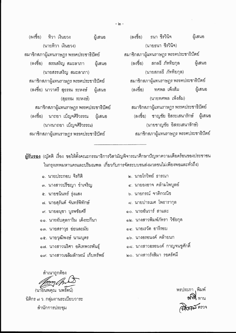 • ญัตติ เรื่อง ขอให้ตั้งคณะกรรมาธิการวิสามัญพิจารณาศึกษาปัญหาความเดือดร้อนของประชาชนในกรุงเทพมหานครและปริมณฑล เกี่ยวกับการจัดระบบขนส่งมวลชนไม่เพียงพอและทั่วถึง (นายสมัย เจริญช่าง กับคณะ เป็นผู้เสนอ)