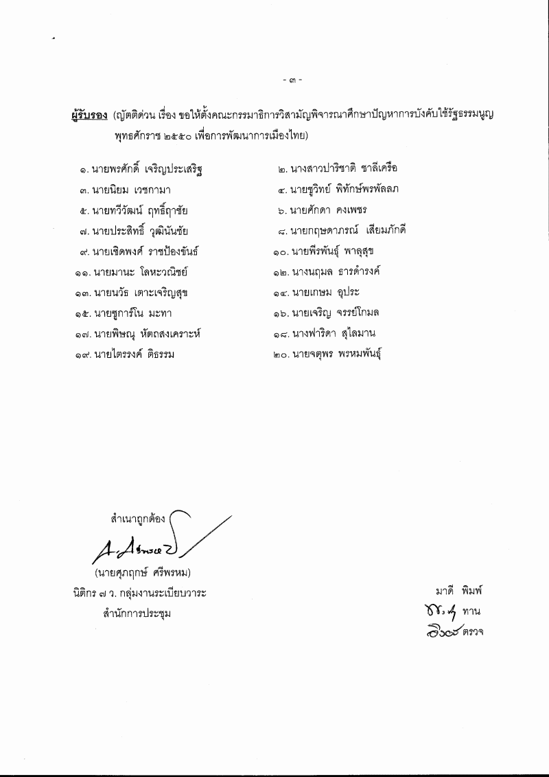 ชื่อเอกสาร :   ญัตติด่วน เรื่อง ขอให้ตั้งคณะกรรมาธิการวิสามัญพิจารณาศึกษาปัญหาการบังคับใช้รัฐธรรมนูญ พุทธศักราช ๒๕๕๐ เพื่อการพัฒนาการเมืองไทย (นายจุมพฏ บุญใหญ่ กับคณะ เป็นผู้เสนอ)