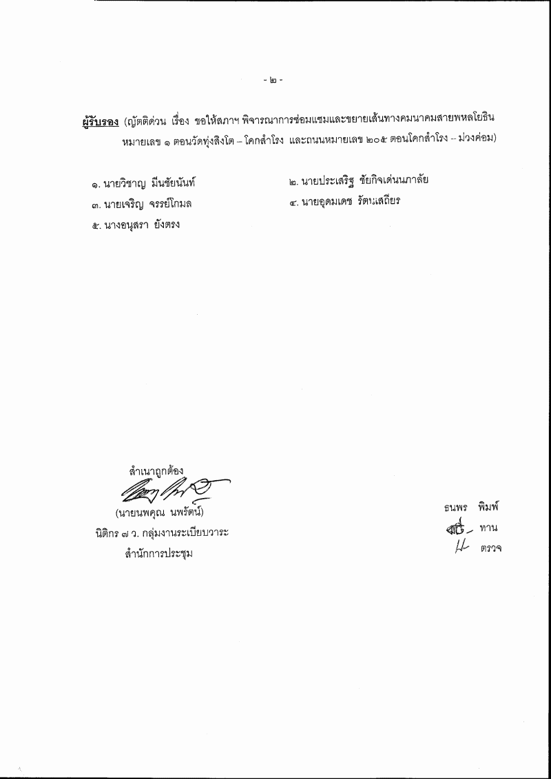 • ญัตติ เรื่อง ขอให้สภาฯ พิจาณาการซ่อมแซมและขยายเส้นทางคมนาคมสายพหลโยธินหมายเลข ๑ ตอนวัดทุ่งสิงโต - โคกสำโรง และถนนหมายเลข ๒๐๕ ตอนโคกสำโรง - ม่วงค่อม (นายอำนวย คลังผา เป็นผู้เสนอ)