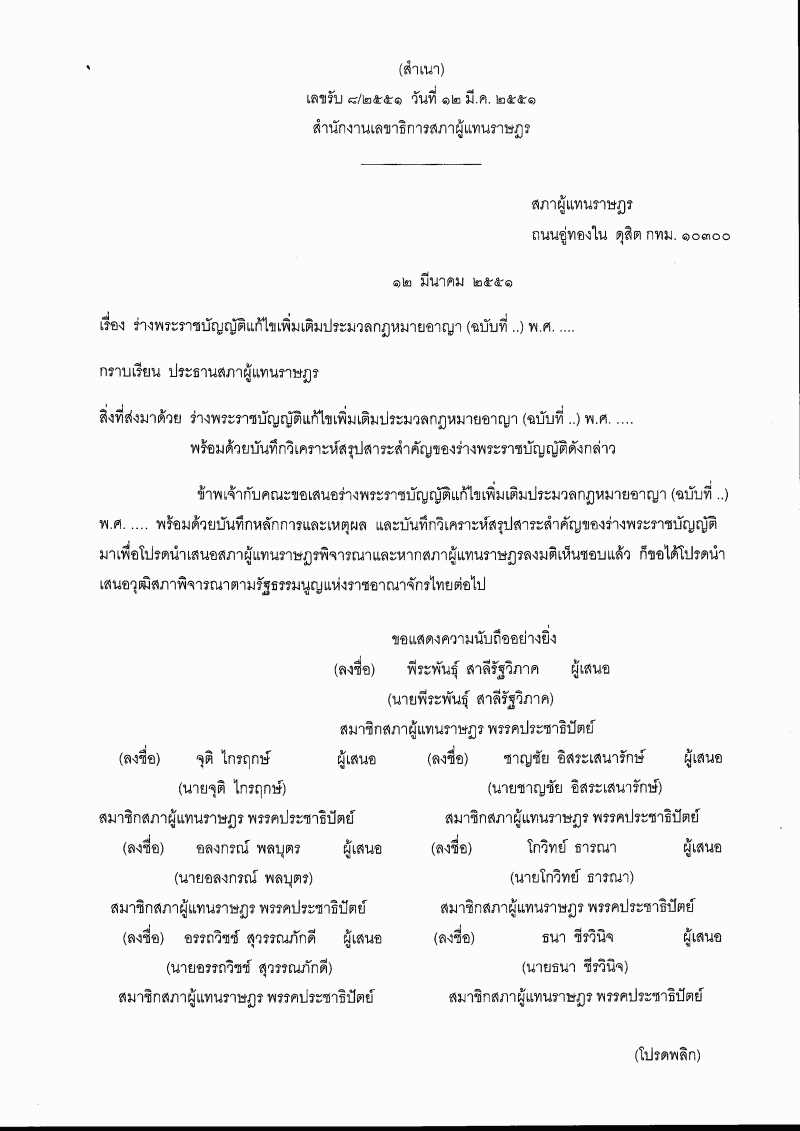• (๘) ร่างพระราชบัญญัติแก้ไขเพิ่มเติมประมวลกฎหมายอาญา (ฉบับที่ ..) พ.ศ. .... (นายพีระพันธุ์ สาลีรัฐวิภาค กับคณะ เป็นผู้เสนอ)