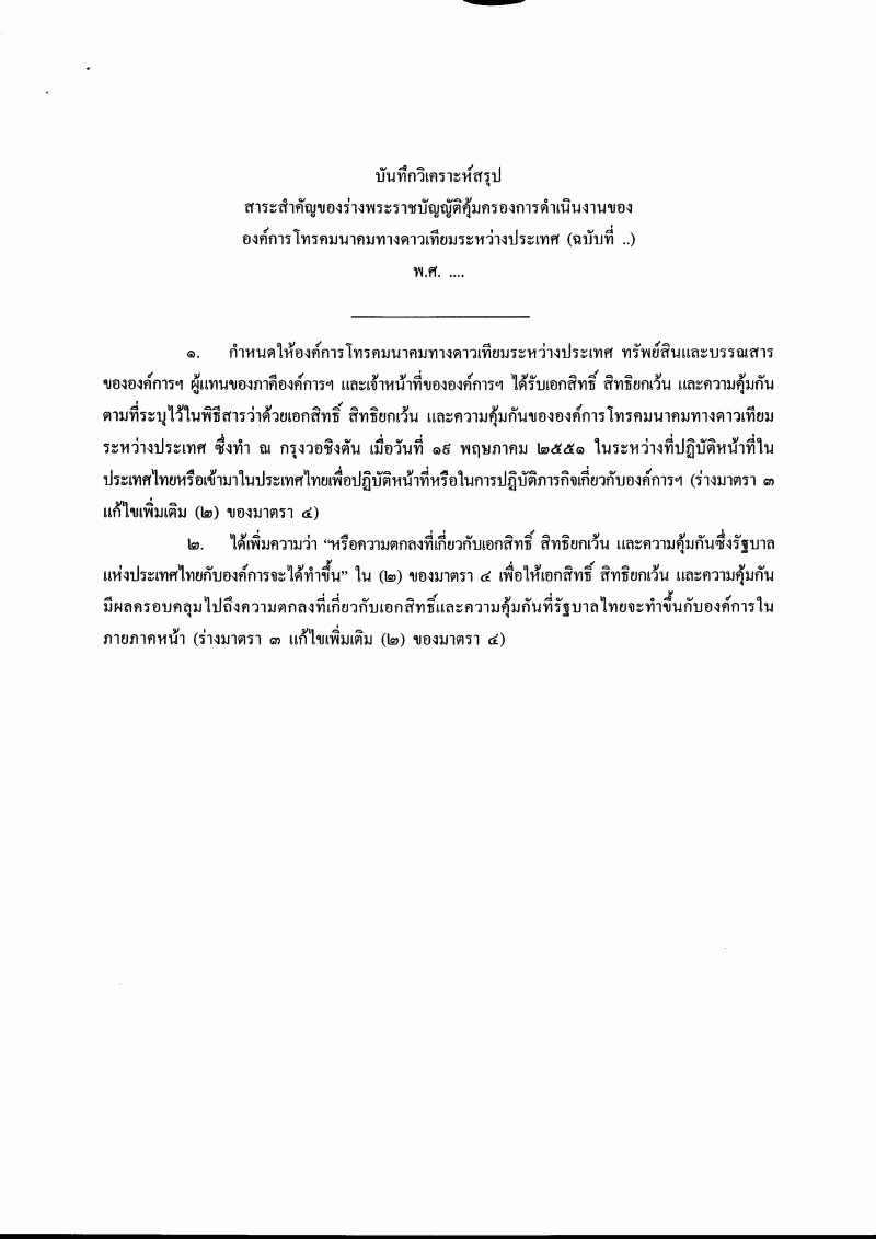 • ร่างพระราชบัญญัติคุ้มครองการดำเนินงานขององค์การโทรคมนาคมทางดาวเทียมระหว่างประเทศ (ฉบับที่ ..) พ.ศ. .... (นายวิชาญ มีนชัยนันท์ กับคณะ เป็นผู้เสนอ)