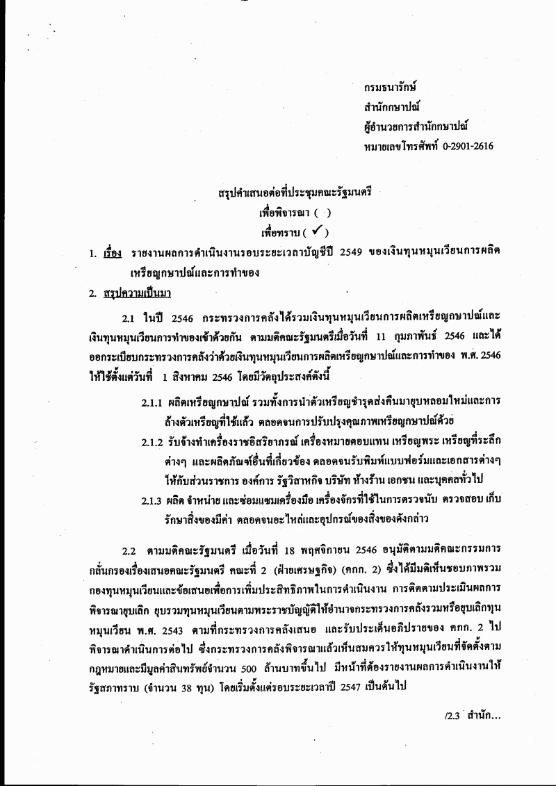ชื่อเอกสาร :   รายงานผลการดำเนินงานรอบระยะเวลาบัญชีปี ๒๕๔๙ ของเงินทุนหมุนเวียนการผลิตเหรียญกษาปณ์และการทำของ