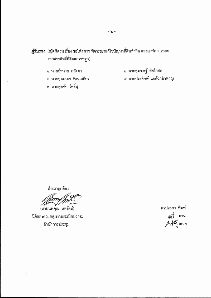 • (๑๓) ญัตติ เรื่อง ขอให้สภาฯ พิจารณาแก้ไขปัญหาที่ดินทำกิน และเร่งรัดการออกเอกสารสิทธิ์ที่ดินแก่ราษฎร (นายสุชาติ ลายน้ำเงิน เป็นผู้เสนอ)