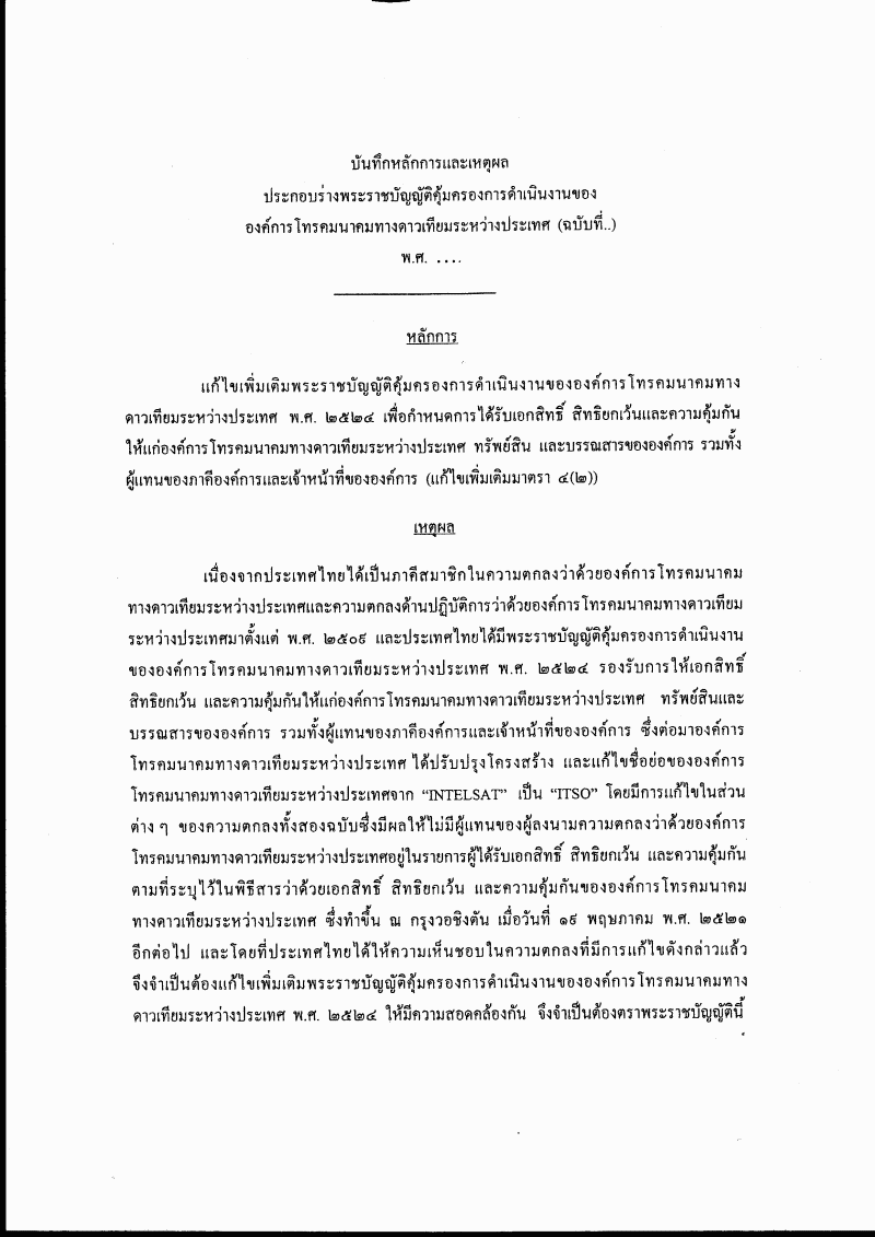 ชื่อเอกสาร :   (๑๕) ร่างพระราชบัญญัติคุ้มครองการดำเนินงานขององค์การโทรคมนาคมทางดาวเทียมระหว่างประเทศ (ฉบับที่ ..) พ.ศ. .... (นายสมเกียรติ ศรลัมพ์ กับคณะ เป็นผู้เสนอ)