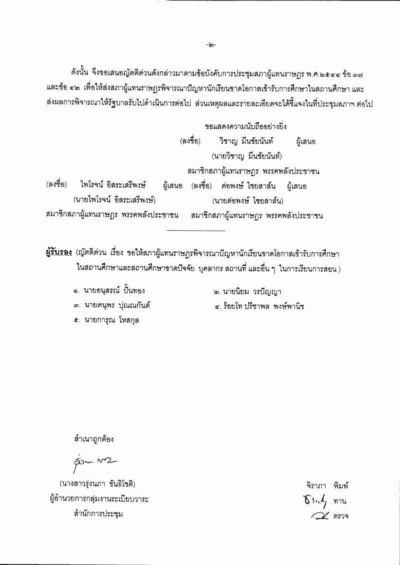 ชื่อเอกสาร :   (21) ญัตติด่วน เรื่อง ขอให้สภาผู้แทนราษฎรพิจารณาปัญหานักเรียนขาดโอกาสเข้ารับการศึกษาในสถานศึกษาและสถานศึกษาขาดปัจจัย บุคลากร สถานที่ และอื่น ๆ ในการเรียนการสอน (นายวิชาญ มีนชัยนันท์ กับคณะ เป็นผู้เสนอ)