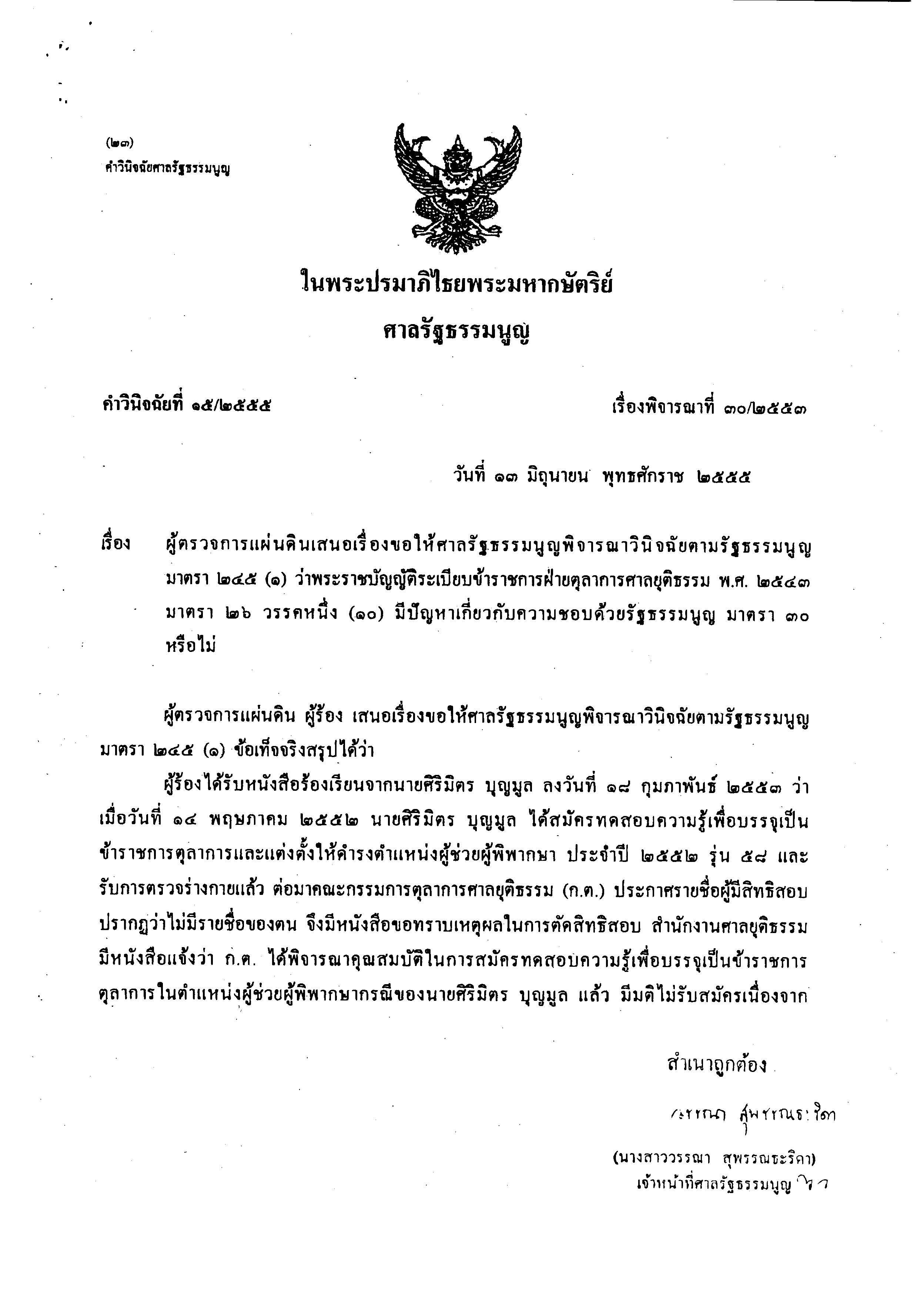 • ๒.๔ รับทราบคำวินิจฉัยศาลรัฐธรรมนูญ กรณีผู้ตรวจการแผ่นดินเสนอเรื่องขอให้ศาลรัฐธรรมนูญพิจารณาวินิจฉัยตามรัฐธรรมนูญ มาตรา ๒๔๕ (๑) ว่าพระราชบัญญัติระเบียบข้าราชการฝ่ายตุลาการศาลยุติธรรม พ.ศ. ๒๕๔๓ มาตรา ๒๖ วรรคหนึ่ง (๑๐) มีปัญหาเกี่ยวกับความชอบด้วยรัฐธรรมนูญ มาตรา ๓๐ หรือไม่