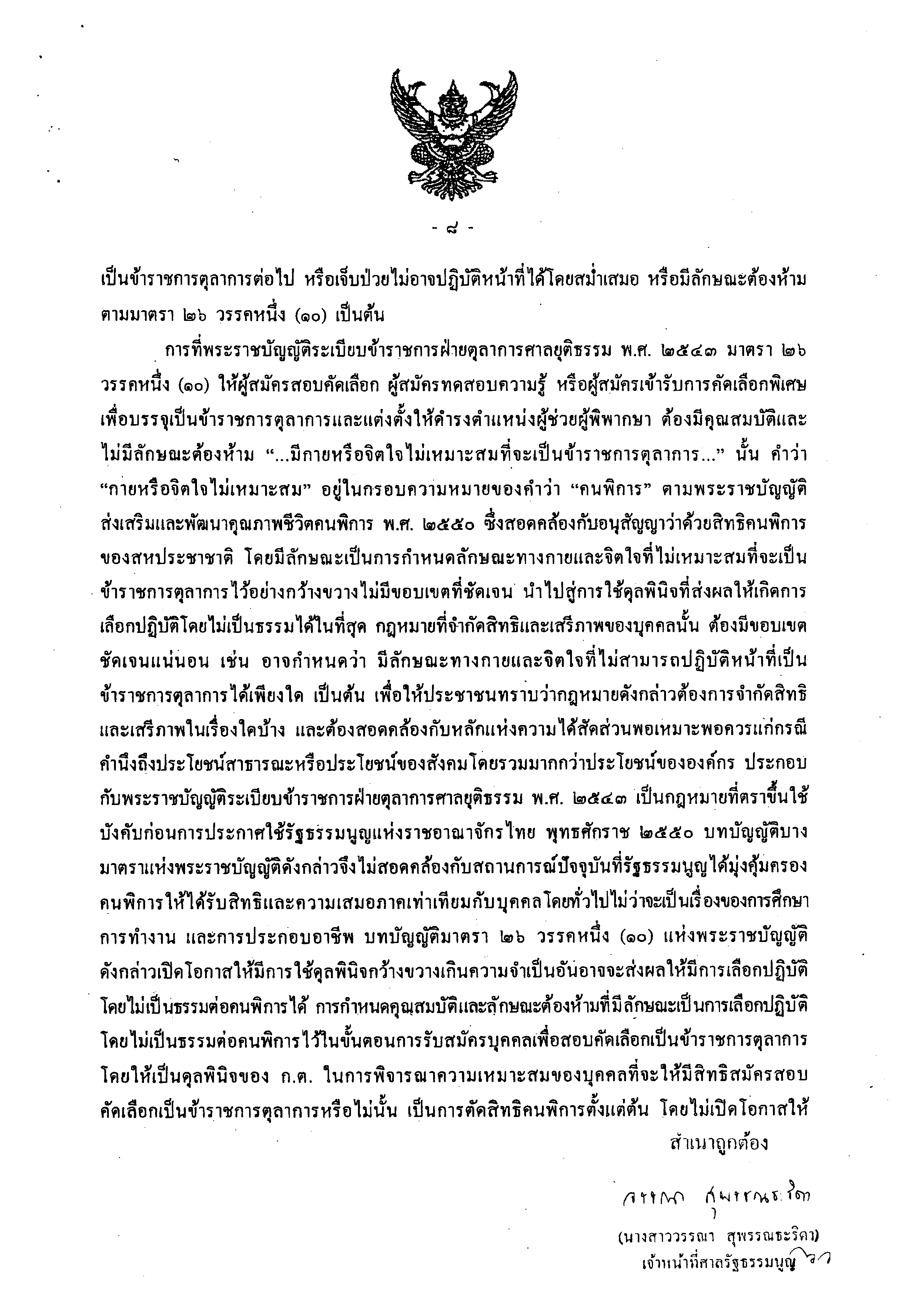 ชื่อเอกสาร :   ๒.๔ รับทราบคำวินิจฉัยศาลรัฐธรรมนูญ กรณีผู้ตรวจการแผ่นดินเสนอเรื่องขอให้ศาลรัฐธรรมนูญพิจารณาวินิจฉัยตามรัฐธรรมนูญ มาตรา ๒๔๕ (๑) ว่าพระราชบัญญัติระเบียบข้าราชการฝ่ายตุลาการศาลยุติธรรม พ.ศ. ๒๕๔๓ มาตรา ๒๖ วรรคหนึ่ง (๑๐) มีปัญหาเกี่ยวกับความชอบด้วยรัฐธรรมนูญ มาตรา ๓๐ หรือไม่