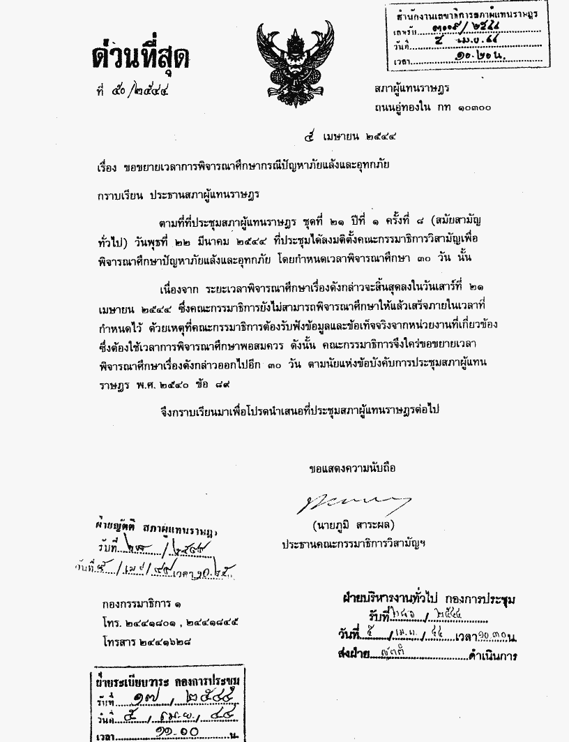 ๗.๒ คณะกรรมาธิการวิสามัญพิจารณาศึกษากรณีปัญหาภัยแล้งและอุทกภัย ขอขยายเวลาพิจารณาศึกษาเรื่องดังกล่าวออกไปอีก ๓๐ วัน นับตั้งแต่ ๒๒ เมษายน ๒๕๔๔ |