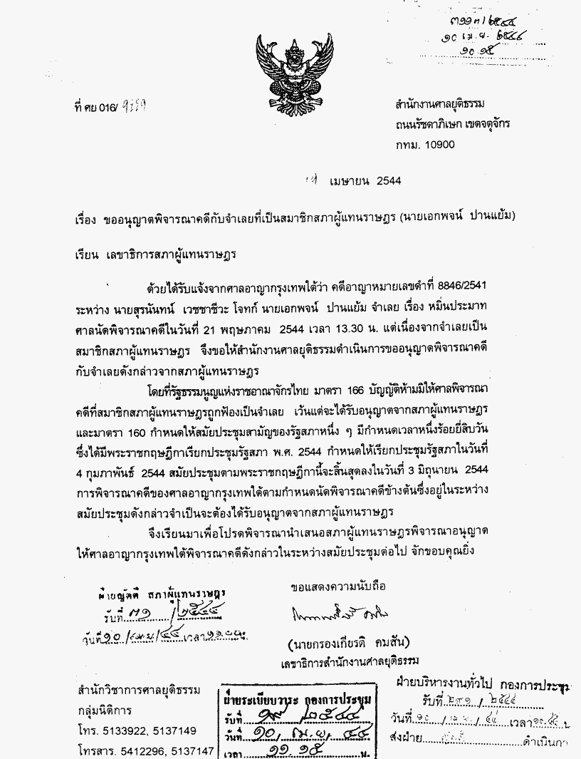 ขออนุญาตพิจารณาคดีกับจำเลยที่เป็นสมาชิกสภาผู้แทนราษฎร (นายเอกพจน์ ปานแย้ม) |