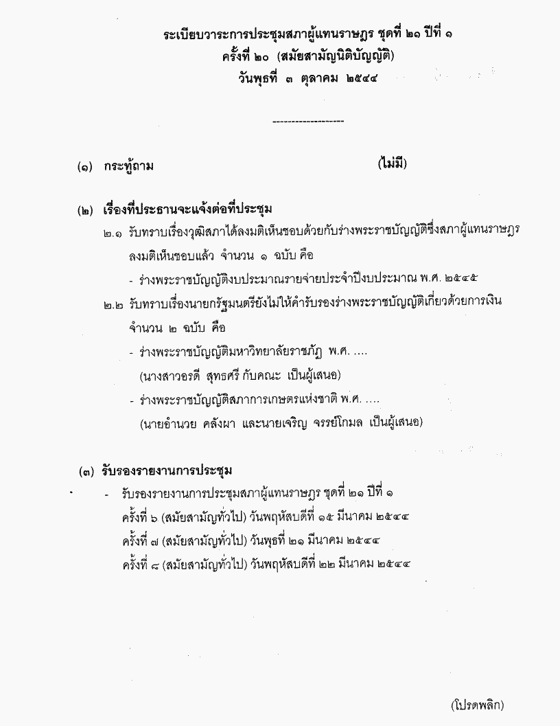• ระเบียบวาระการประชุมสภาผู้แทนราษฎร ชุดที่ 21 ปีที่ 1 ครั้งที่ 20 (สมัยสามัญนิติบัญญัติ) วันพุธที่ 3 ตุลาคม 2544