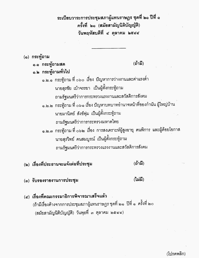 • ระเบียบวาระการประชุมสภาผู้แทนราษฎร ชุดที่ 21 ปีที่ 1 ครั้งที่ 21 (สมัยสามัญนิติบัญญัติ) วันพฤหัสบดีที่ 4 ตุลาคม 2544