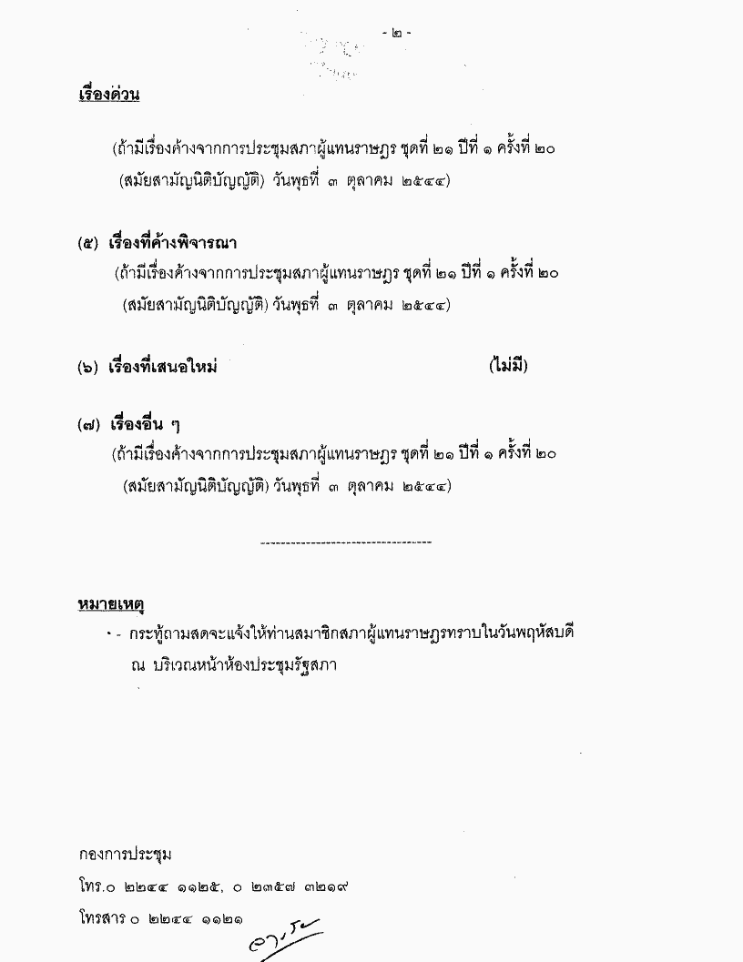 ระเบียบวาระการประชุมสภาผู้แทนราษฎร ชุดที่ 21 ปีที่ 1 ครั้งที่ 21 (สมัยสามัญนิติบัญญัติ) วันพฤหัสบดีที่ 4 ตุลาคม 2544 |