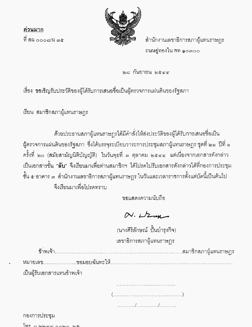ชื่อเอกสาร : ขอเชิญรับประวัติของผู้ใด้รับการเสนอชื่อเป็นผู้ตรวจการแผ่นดินของรัฐสภา