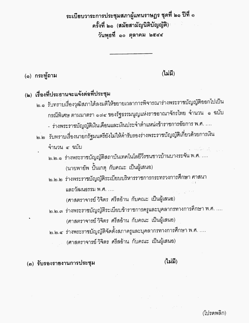• ระเบียบวาระการประชุมสภาผู้แทนราษฎร ชุดที่ 21 ปีที่ 1 ครั้งที่ 21 (สมัยสามัญนิติบัญญัติ) วันพุธที่ 10 ตุลาคม 2544