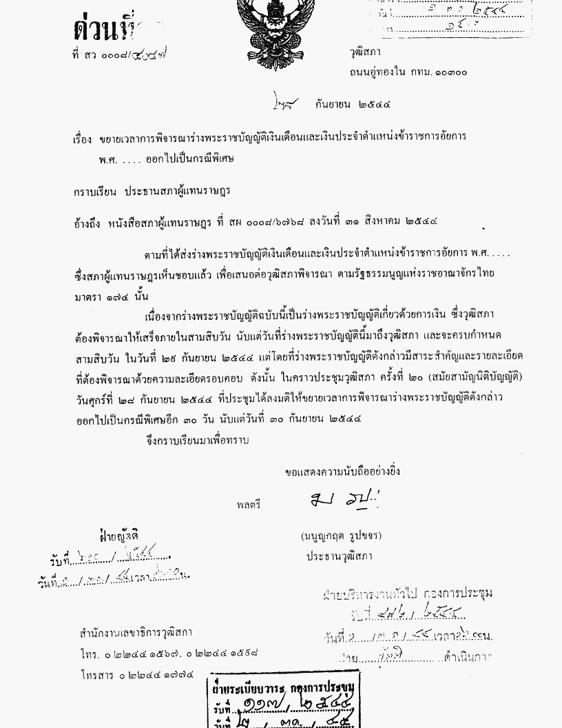 ขยายเวลาการพิจารณาร่างพระราชบัญญัติเงินเดือนและเงินประจำตำแหน่งข้าราชการอัยการ พ.ศ. .... ออกไปเป็นกรณีพิเศษ |