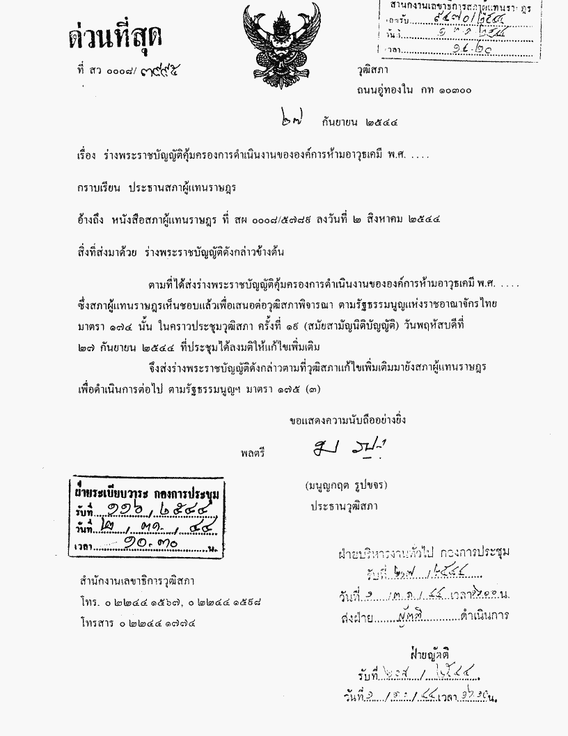 • ร่างพระราชบัญญัติคุ้มครองการดำเนินงานขององค์การ ห้ามอาวุธเคมี พ.ศ. ....