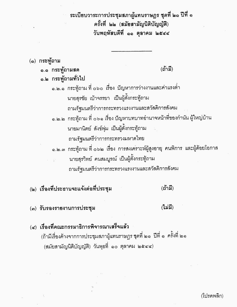 ระเบียบวาระการประชุมสภาผู้แทนราษฎร ชุดที่ 21 ปีที่ 1 ครั้งที่ 22 (สมัยสามัญนิติบัญญัติ) วันพฤหัสบดีที่ 11 ตุลาคม 2544 |