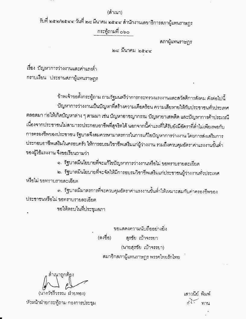 กระทู้ถาม ที่ 060 เรื่อง ปัญหาการว่างงานและค่าแรงต่ำ นายสุรชัย เบ้าจรรยา เป็นผู้ตั้งกระทู้ถาม ถามรัฐมนตรีว่าการกระทวงแรงงานและสวัสดิการสังคม |