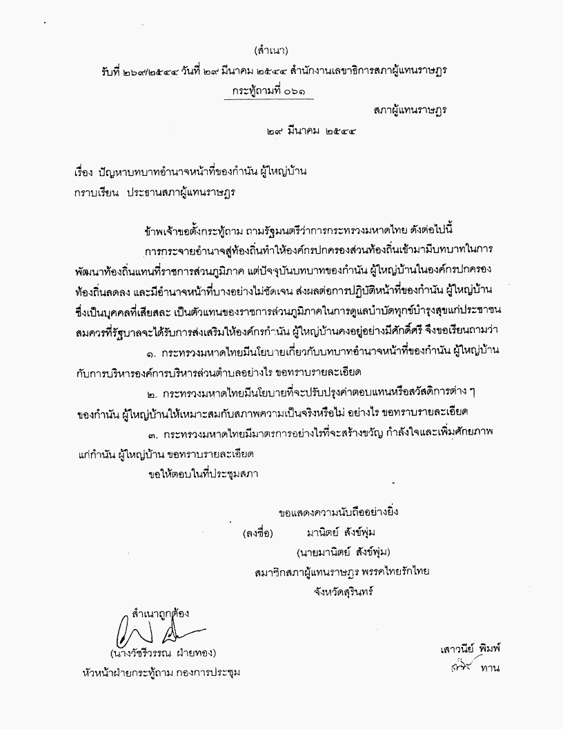 กระทู้ถาม ที่ 061 เรื่อง ปัญหาบทบาทอำนาจหน้าที่ของกำนัน ผู้ใหญ่บ้าน นายมานิตย์ สังข์พุ่ม เป็นผู้ตั้งกระทู้ถาม ถามรัฐมนตรีว่ากากระทรวงมหาดไทย |