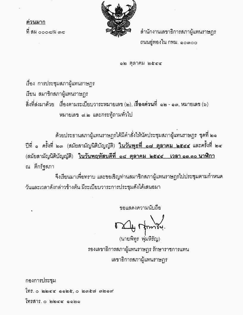 • ระเบียบวาระการประชุมสภาผู้แทนราษฎร ชุดที่ 21 ปีที่ 1 ครั้งที่ 23 (สมัยสามัญนิติบัญญัติ) วันพุธที่ 17 ตุลาคม 2544