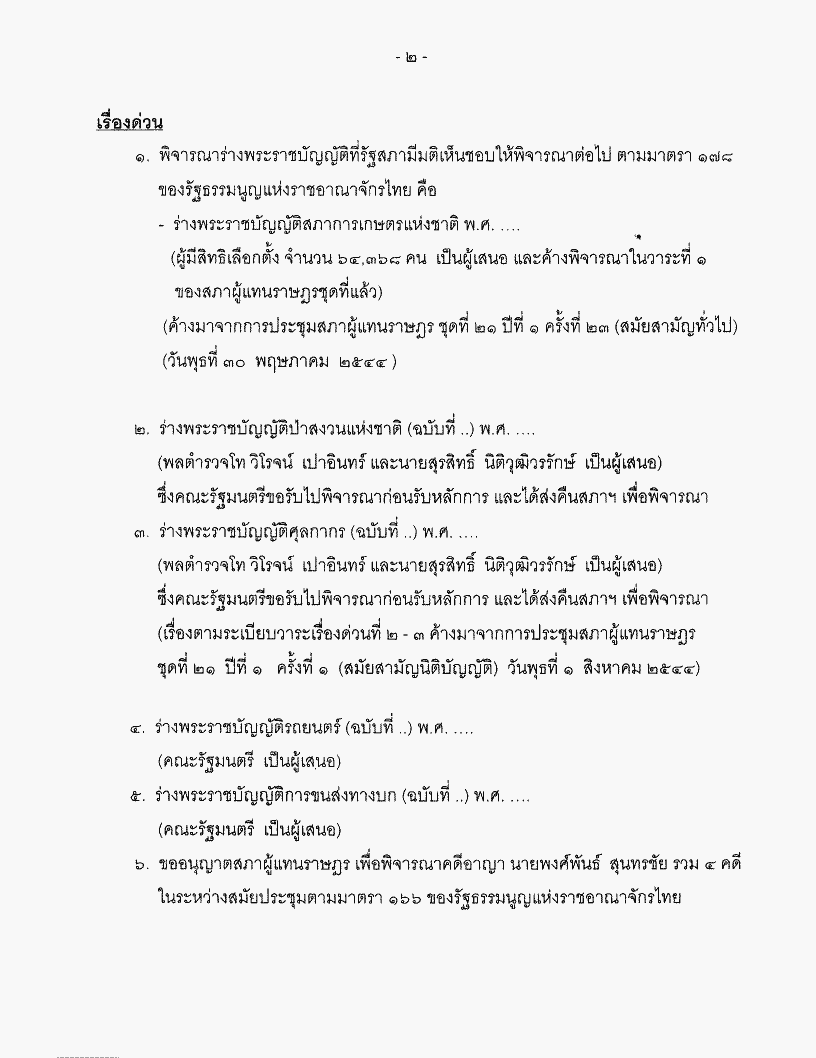 • ระเบียบวาระการประชุมสภาผู้แทนราษฎร ชุดที่ 21 ปีที่ 1 ครั้งที่ 23 (สมัยสามัญนิติบัญญัติ) วันพุธที่ 17 ตุลาคม 2544