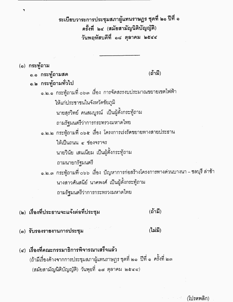 ระเบียบวาระการประชุมสภาผู้แทนราษฎร ชุดที่ 21 ปีที่ 1 ครั้งที่ 24 (สมัยสามัญนิติบัญญัติ) วันพฤหัสบดีที่ 18 ตุลาคม 2544 |