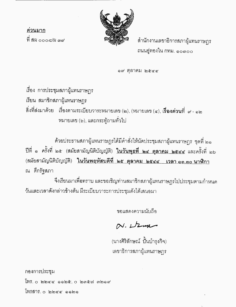 • ระเบียบวาระการประชุมสภาผู้แทนราษฎร ชุดที่ 21 ปีที่ 1 ครั้งที่ 25 (สมัยสามัญนิติบัญญัติ) วันพุธที่ 24 ตุลาคม 2544