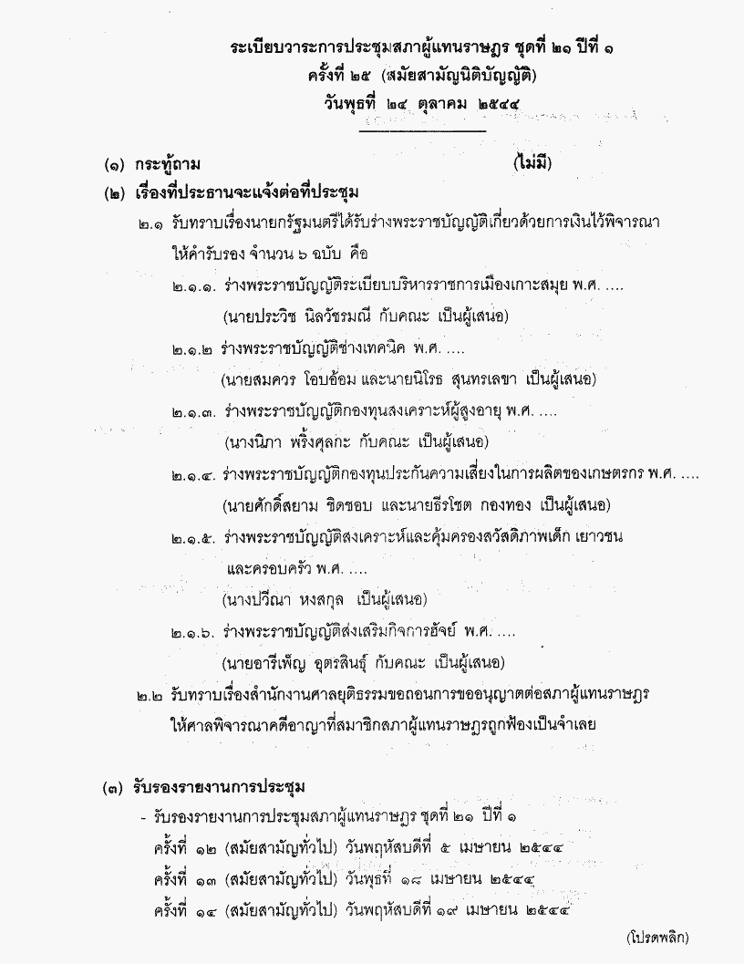 • ระเบียบวาระการประชุมสภาผู้แทนราษฎร ชุดที่ 21 ปีที่ 1 ครั้งที่ 25 (สมัยสามัญนิติบัญญัติ) วันพุธที่ 24 ตุลาคม 2544