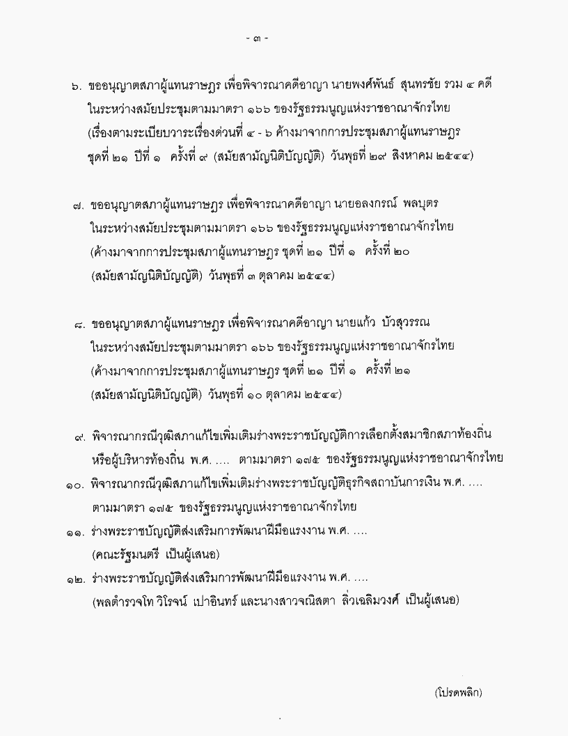 • ระเบียบวาระการประชุมสภาผู้แทนราษฎร ชุดที่ 21 ปีที่ 1 ครั้งที่ 25 (สมัยสามัญนิติบัญญัติ) วันพุธที่ 24 ตุลาคม 2544