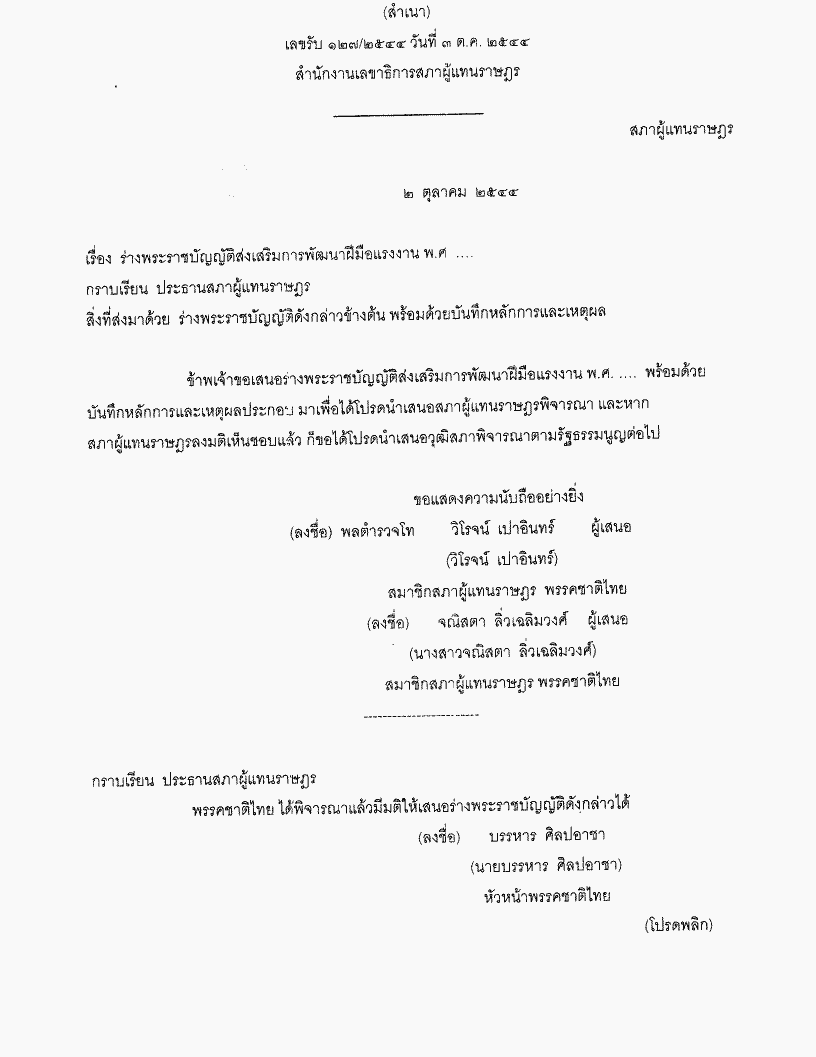 ชื่อเอกสาร :   ร่างพระราชบัญญัติส่งเสริมการพัฒนาฝีมือแรงงาน พ.ศ. .... (พลตำรวจโท วิโรจน์ เปาอินทร์ และนางสาวจณิสตา ลิ่วเฉลิมวงศ์ เป็นผู้เสนอ)
