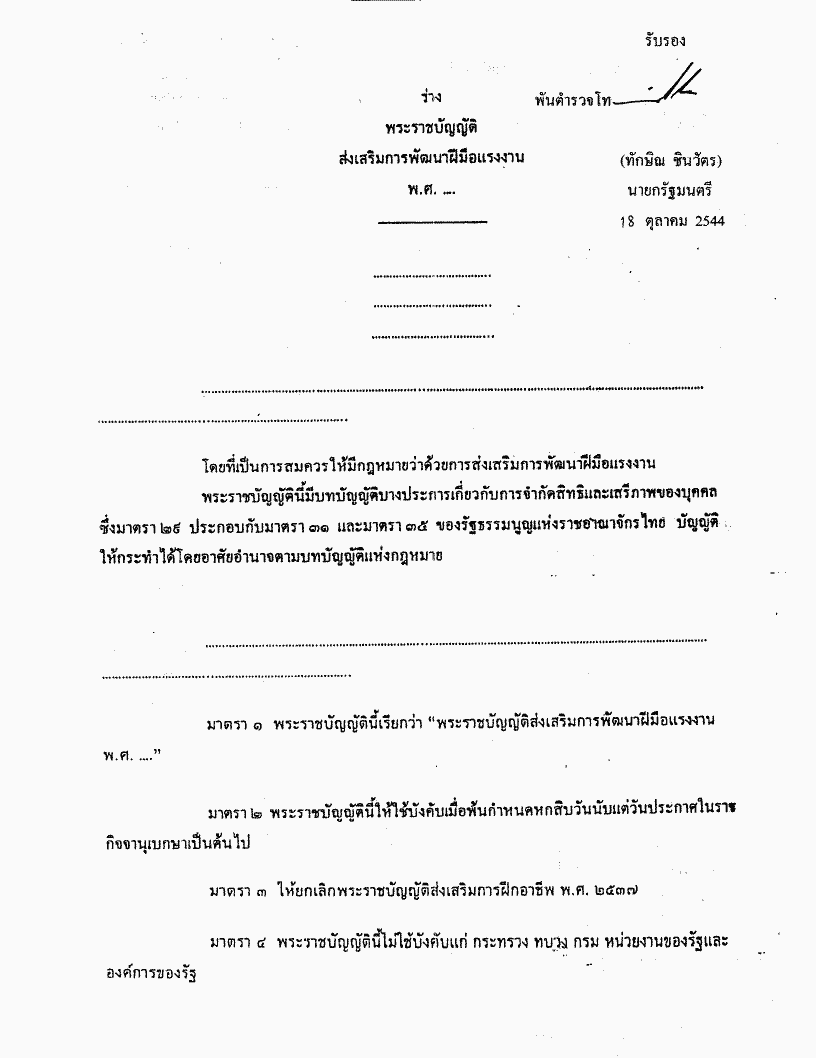 ชื่อเอกสาร :   ร่างพระราชบัญญัติส่งเสริมการพัฒนาฝีมือแรงงาน พ.ศ. .... (พลตำรวจโท วิโรจน์ เปาอินทร์ และนางสาวจณิสตา ลิ่วเฉลิมวงศ์ เป็นผู้เสนอ)