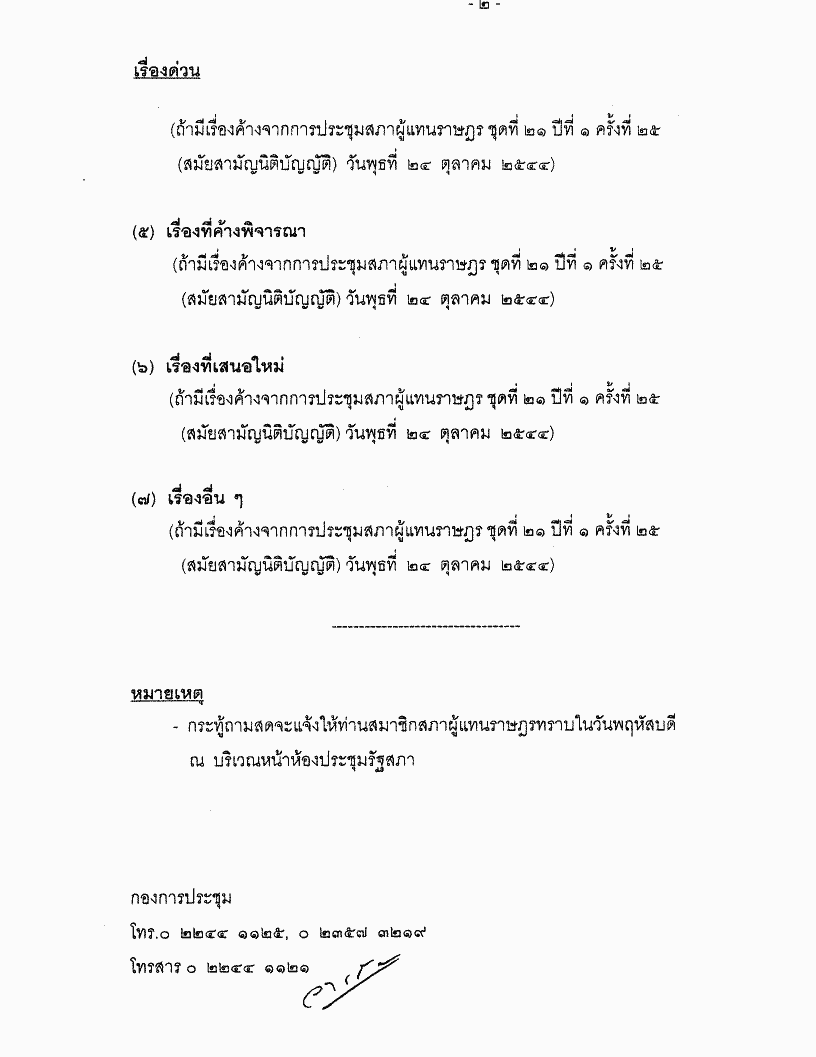 • ระเบียบวาระการประชุมสภาผู้แทนราษฎร ชุดที่ 21 ปีที่ 1 ครั้งที่ 26 (สมัยสามัญนิติบัญญัติ) วันพฤหัสบดีที่ 25 ตุลาคม 2544