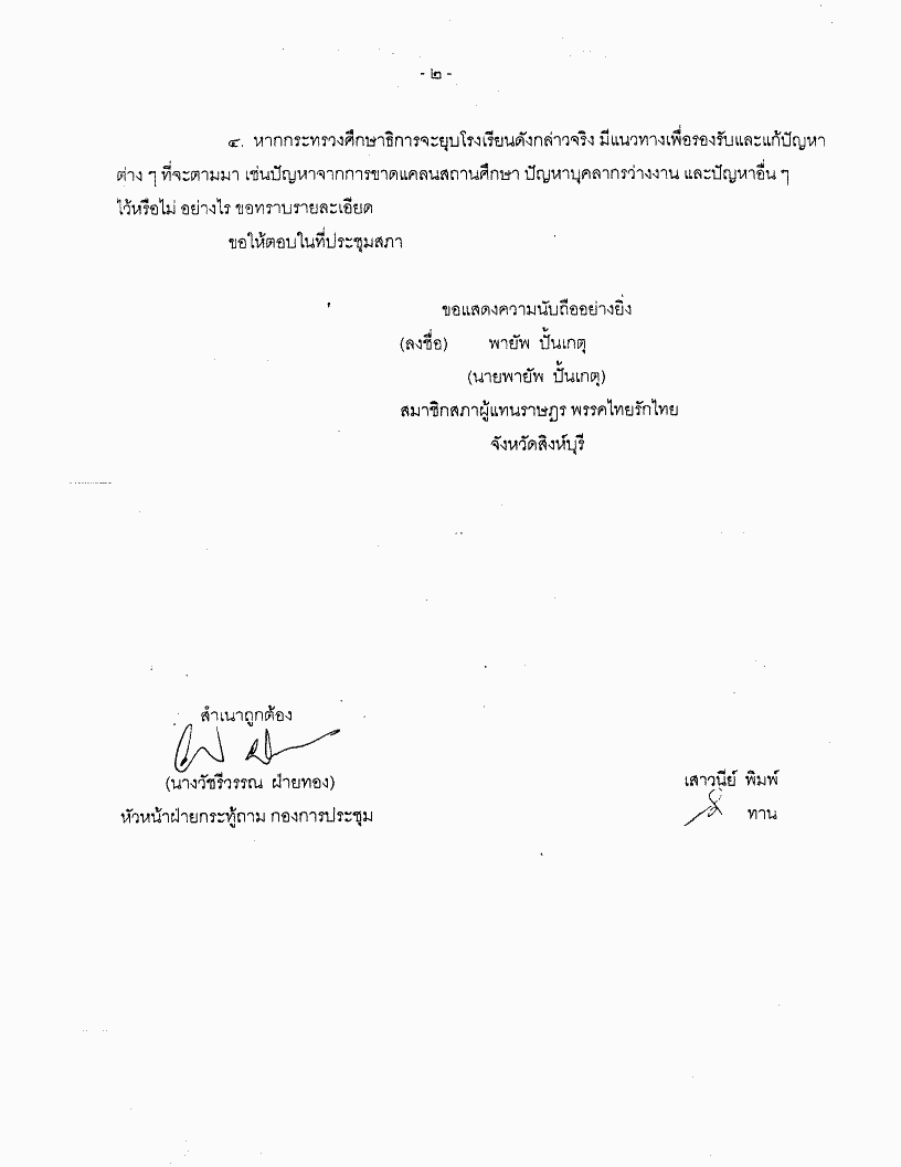กระทู้ถามที่ 069 เรื่อง ปัญหาจากการยุบโรงเรียนระดับประถมศึกษา นายพายัพ ปั้นเกตุ เป็นผู้ตั้งกระทู้ถาม ถามรัฐมนตีรว่าการกระทรวงศึกษาธิการ |