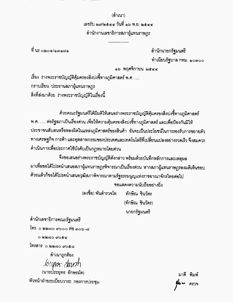 • ร่างพระราชบัญญัติคุ้มครองสิ่งบ่งชี้ทางภูมิศาสตร์ พ.ศ.... (คณะรัฐมนตรี เป็นผู้เสนอ)