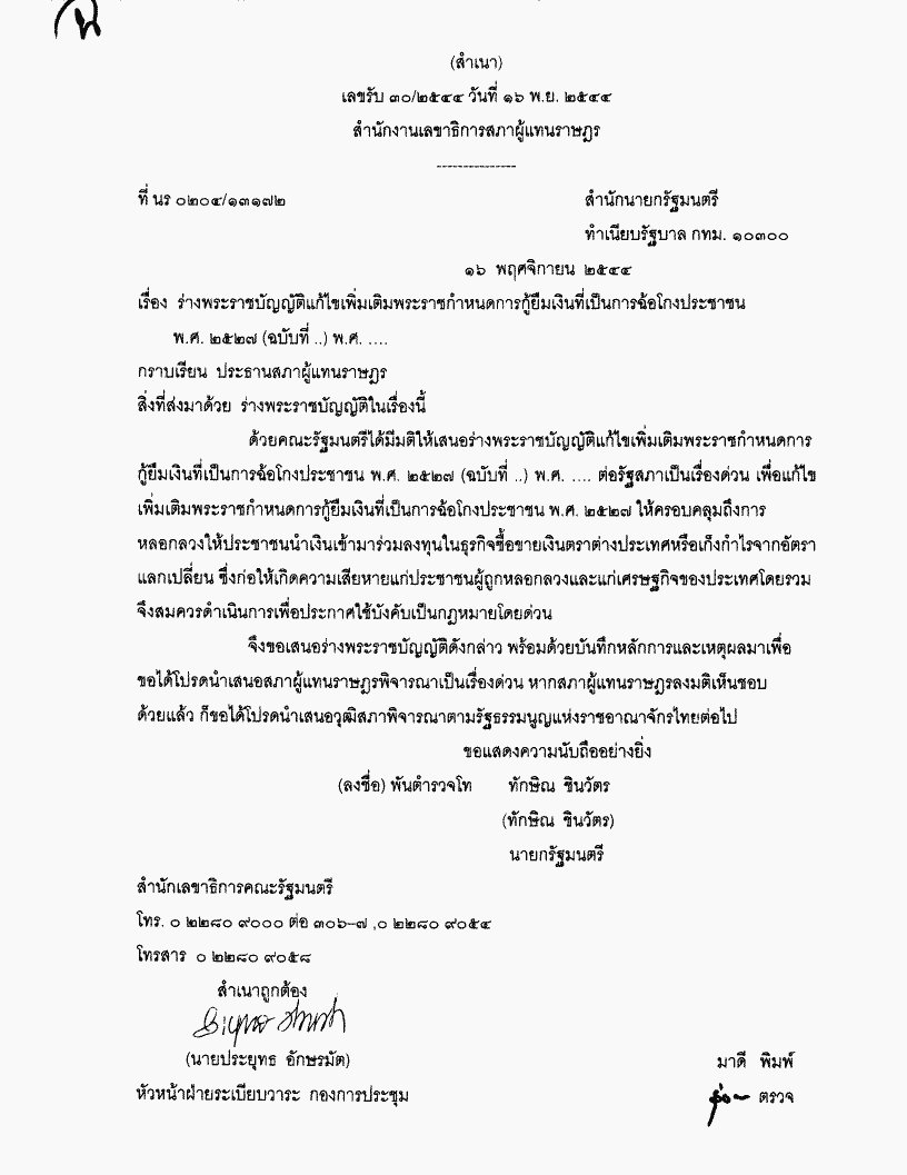 • ร่างพระราชบัญญัติแก้ไขเพิ่มเติมพระราชกำหนดการกู้ยืมเงินที่เป็นการฉ้อโกงประชาชน พ.ศ. 2527 (ฉบับที่..) พ.ศ.....