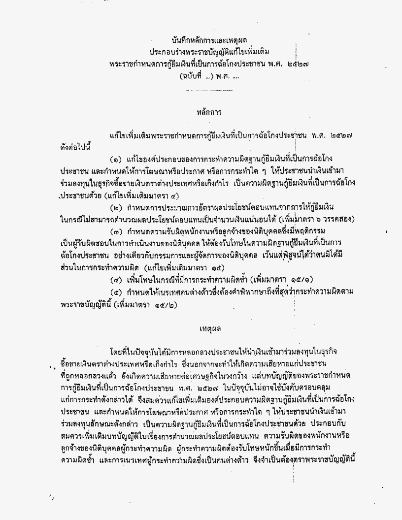 • ร่างพระราชบัญญัติแก้ไขเพิ่มเติมพระราชกำหนดการกู้ยืมเงินที่เป็นการฉ้อโกงประชาชน พ.ศ. 2527 (ฉบับที่..) พ.ศ.....