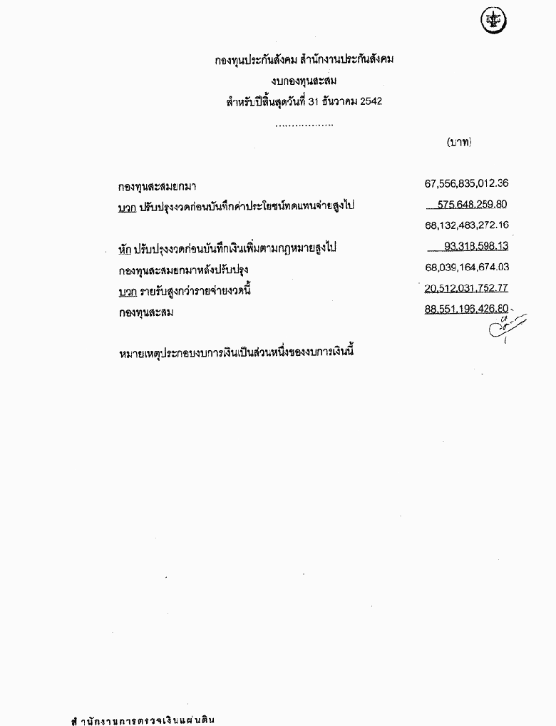 • รายงานการตรวจสอบงบดุล งบรายรับ-รายจ่ายเงินกองทุนประกันสังคม ประจำปี ๒๕๔๒