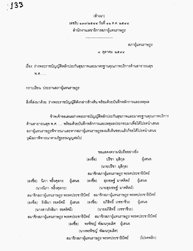 ชื่อเอกสาร :   ร่างพระราชบัญญัติหลักประกันสุขภาพและมาตรฐานคุณภาพบริการด้านสาธารณสุข พ.ศ..... (นายปรีชา มุสิกุล กับคณะ เป็นผู้เสนอ)