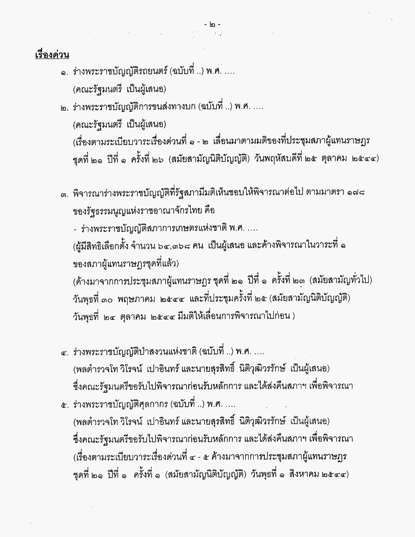 • ระเบียบวาระการประชุมสภาผู้แทนราษฎร ชุดที่ 21 ปีที่ 1 ครั้งที่ 33 (สมัยสามัญนิติบัญญัติ) วันพุธที่ 21 พฤศจิกายน 2544