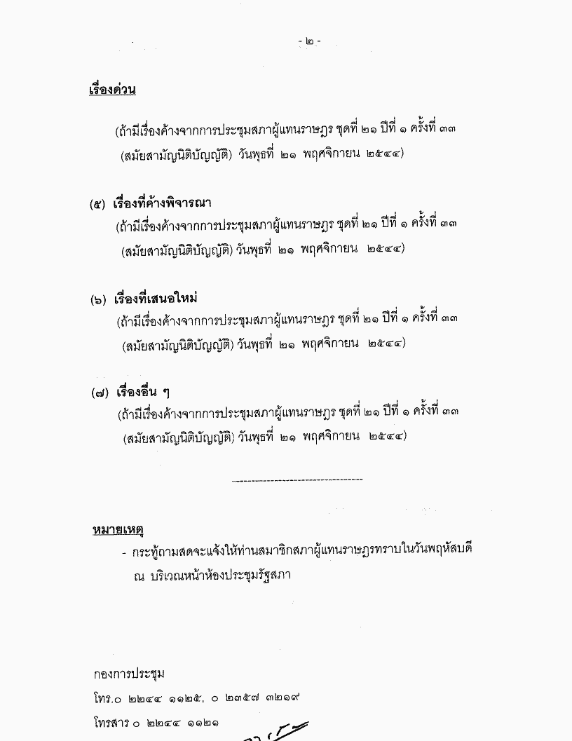ชื่อเอกสาร : ระเบียบวาระการประชุมสภาผู้แทนราษฎร ชุดที่ 21 ปีที่ 1 ครั้งที่ 34 (สมัยสามัญนิติบัญญัติ) วันพฤหัสบดีที่ 22 พฤศจิกายน 2544