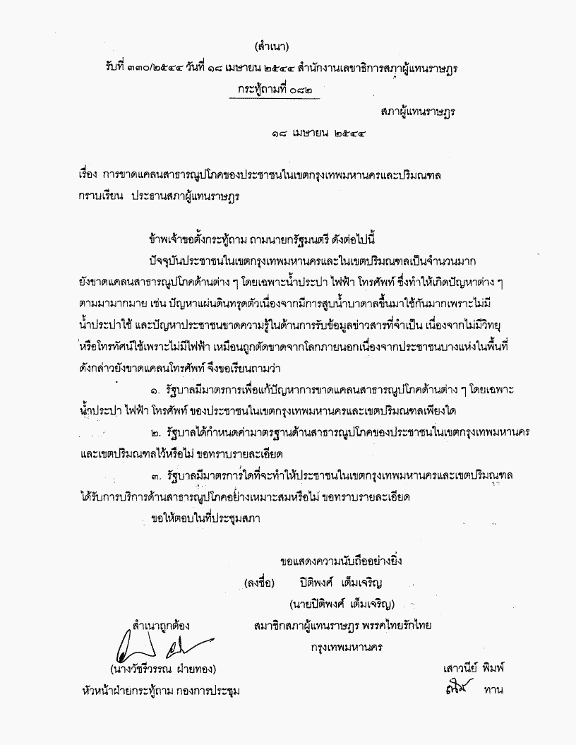 กระทู้ถามที่ 082 เรื่อง การขาดแคลนสาธารณูปโภคของประชาชนในเขตกรุงเทพมหานครและปริมณฑล นายปิติพงศ์ เต็มเจริญ เป็นผู้ตั้งกระทู้ถาม ถามนายกรัฐมนตรี |